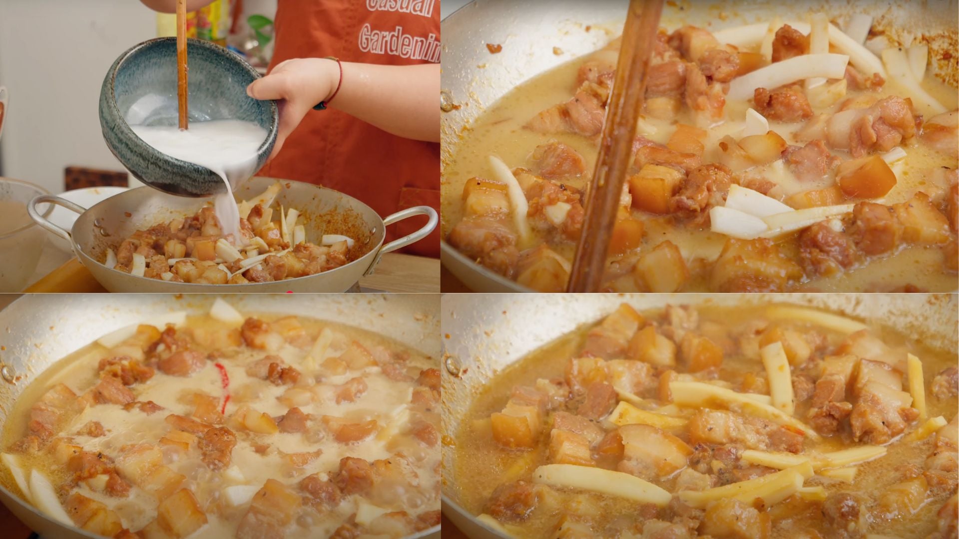 Đổ phần nước cốt dừa đã lọc vào, hạ lửa nhỏ và kho 20 phút cho thịt thấm.