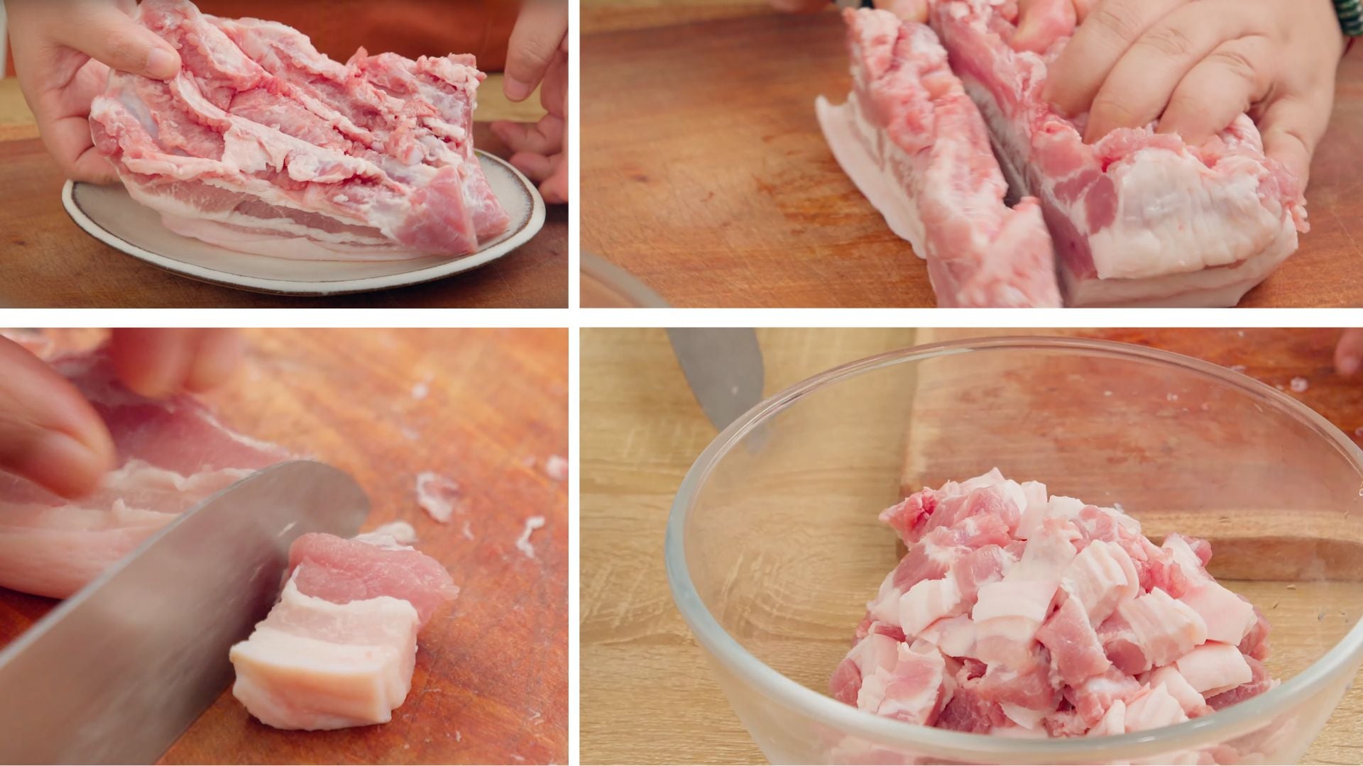 - Thịt ba chỉ: rửa sạch với muối hạt, để ráo. Cắt miếng dài 2–2.5cm